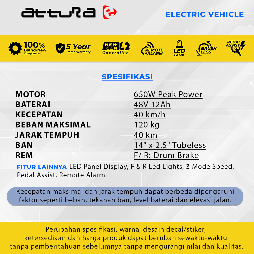 *) Kecepatan maksimal dan jarak tempuh mungkin akan berbeda dipengaruhi faktor seperti beban, tekanan ban, level baterai, performa baterai dan elevasi jalan.
