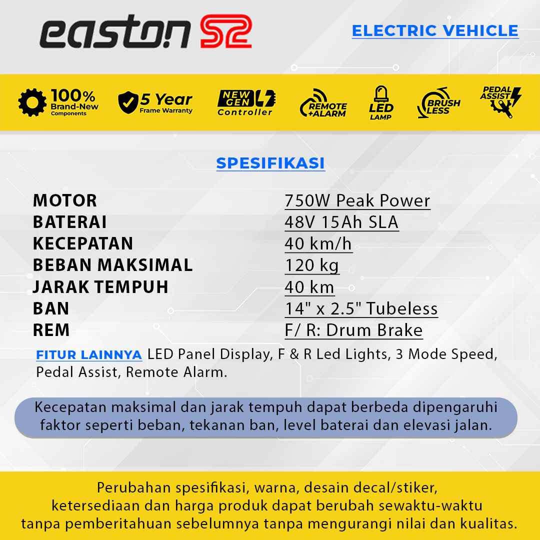 Electric moped serba guna dengan gaya modis, maksimal untuk kebutuhan harian di lingkungan perumahan hingga kota. Sepeda listrik dengan daya besar 750 Watt berteknologi brushless motor yang responsif dan hemat energi listrik. Ergonomis sesuai postur tubuh asia, mudah dioperasikan, banyak fitur canggih, cocok untuk rute jarak pendek, mengantar anak sekolah dan berbelanja.